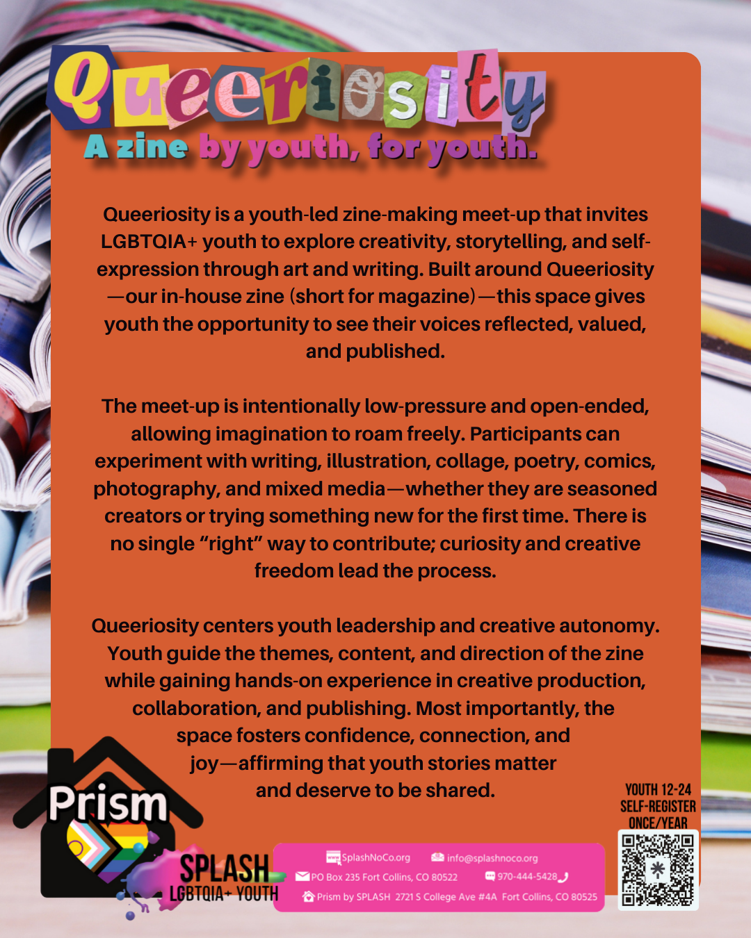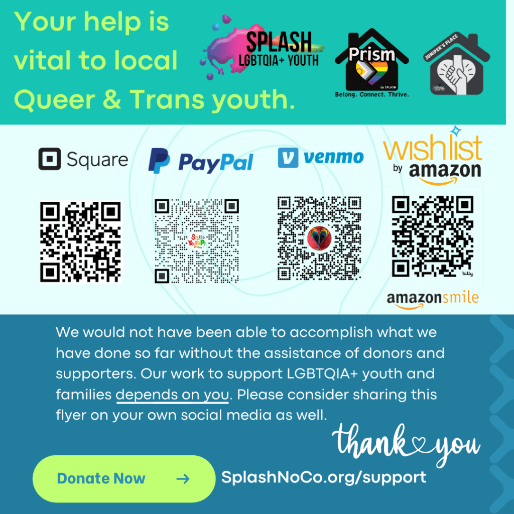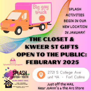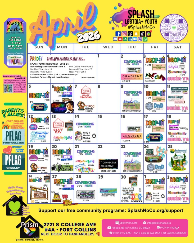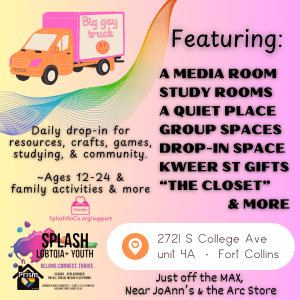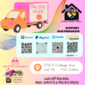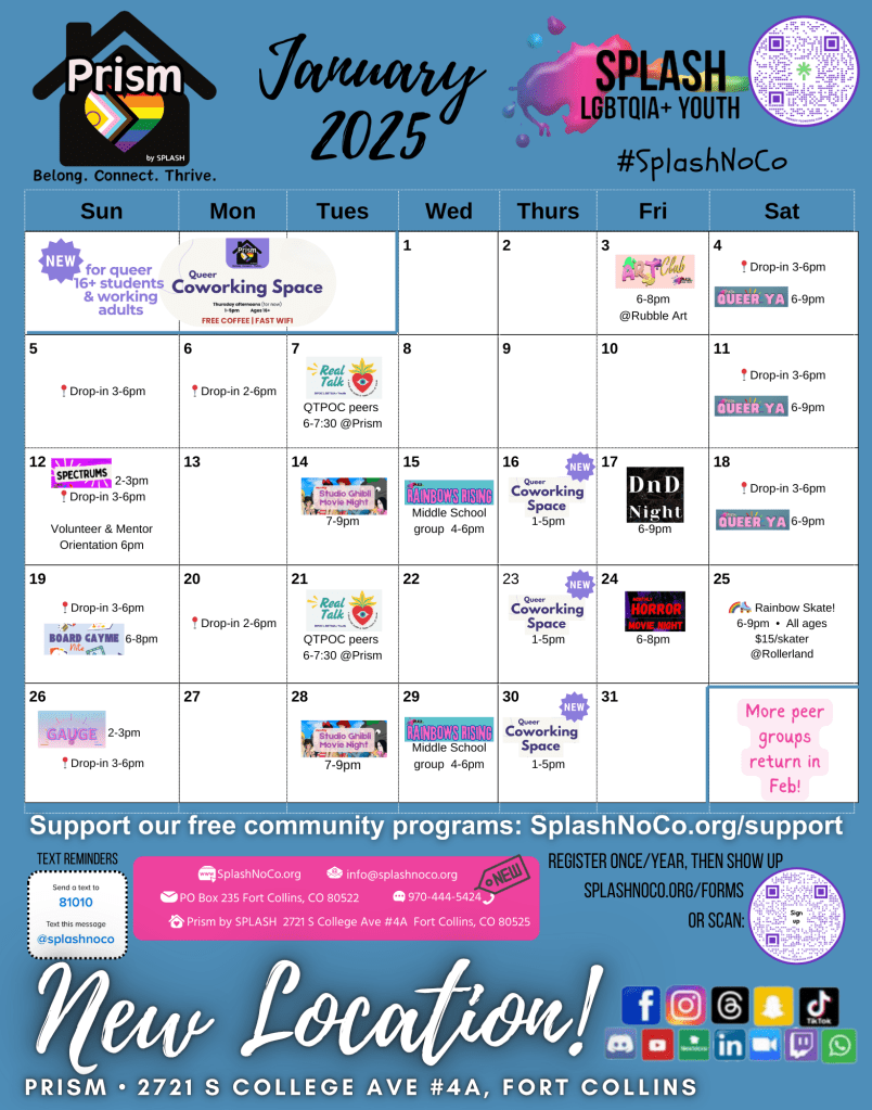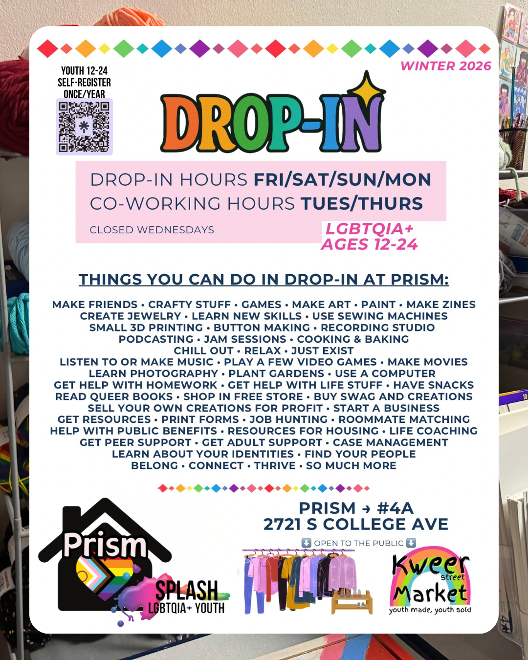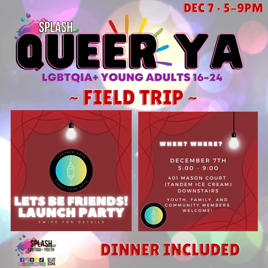 We offer meet-ups and drop-in spaces for youth who are LGBTQIA+ and questioning. We host special events that are fully inclusive of all orientations and identities in substance free, supervised, SafeSpaces.