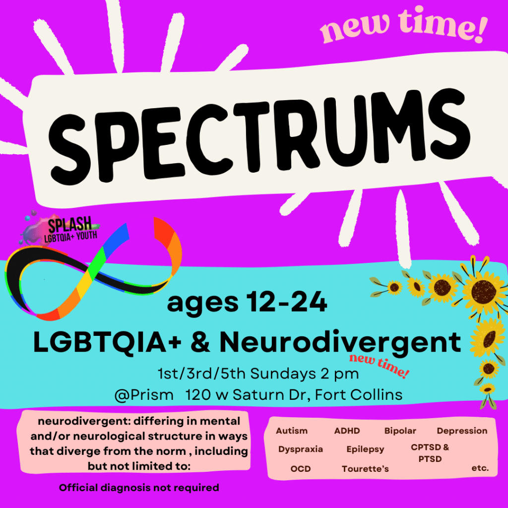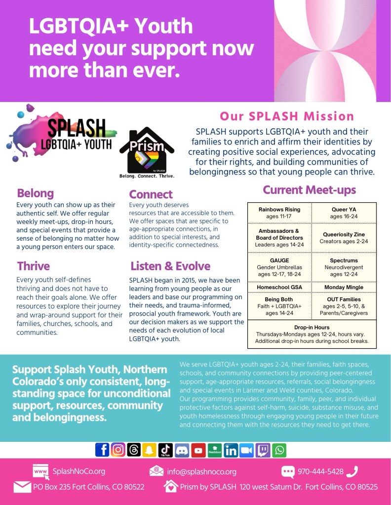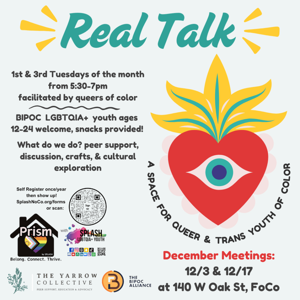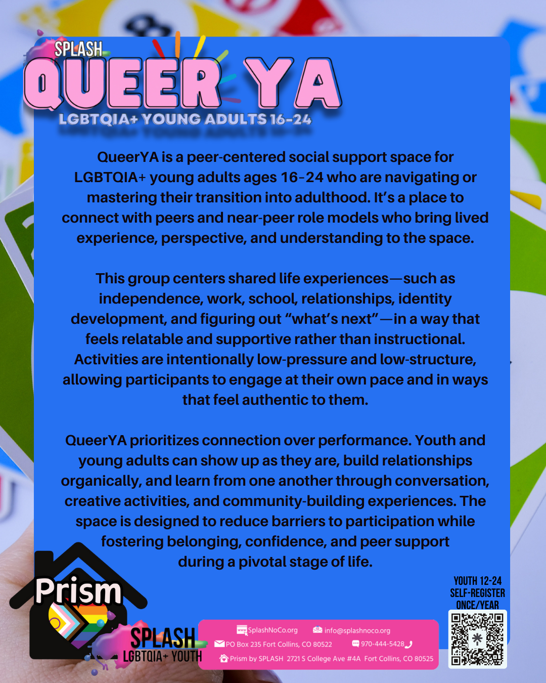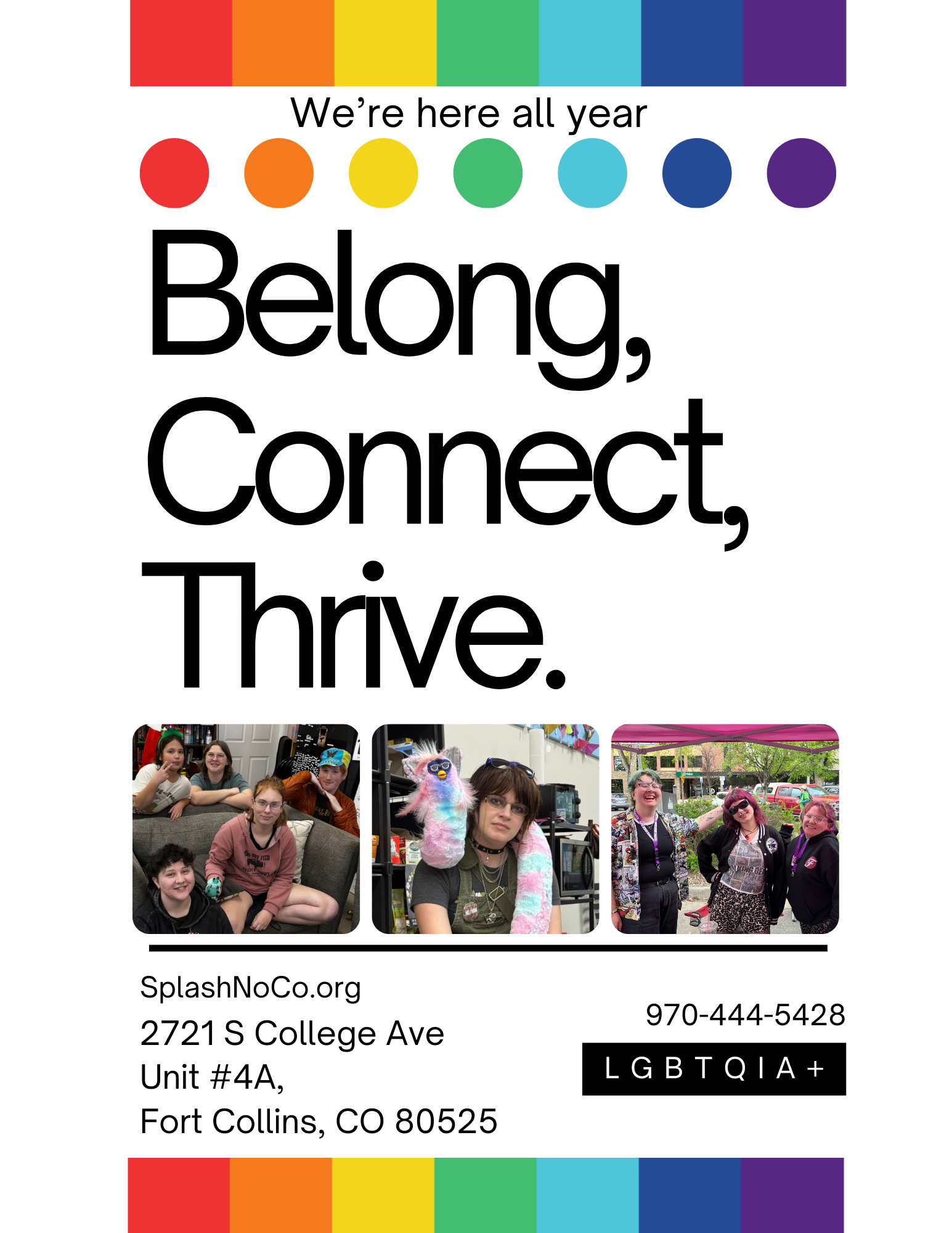 We offer meet-ups and drop-in spaces for youth who are LGBTQIA+ and questioning. We host special events that are fully inclusive of all orientations and identities in substance free, supervised, SafeSpaces.