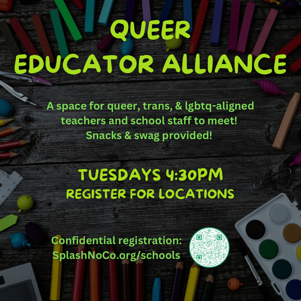 How do we define Educators, Librarians, and school staff? It covers all people in our community who are working day-to-day in the field of education. We know it’s tough being on the front lines, and want to hold space for connecting, growing confidence, and eating yummy snacks. You do not have to be out at work to attend. You MUST be willing to hold confidentiality in this space, outing of peers or sharing personal stories from these spaces can be dangerous and not acceptable for our SPLASH spaces.