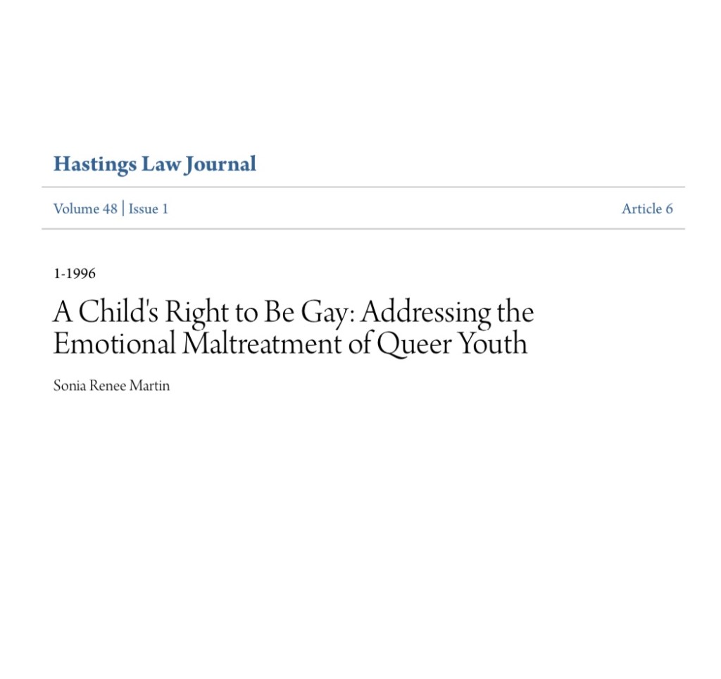 Citation: Sonia Renee Martin, A Child’s Right to Be Gay: Addressing the Emotional Maltreatment of Queer Youth, 48 Hastings L.J. 167 (1996). Available at: https://repository.uchastings.edu/hastings_law_journal/vol48/iss1/6