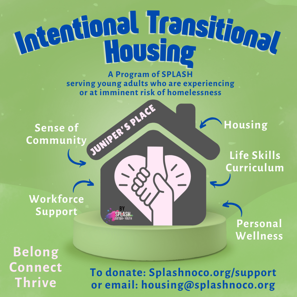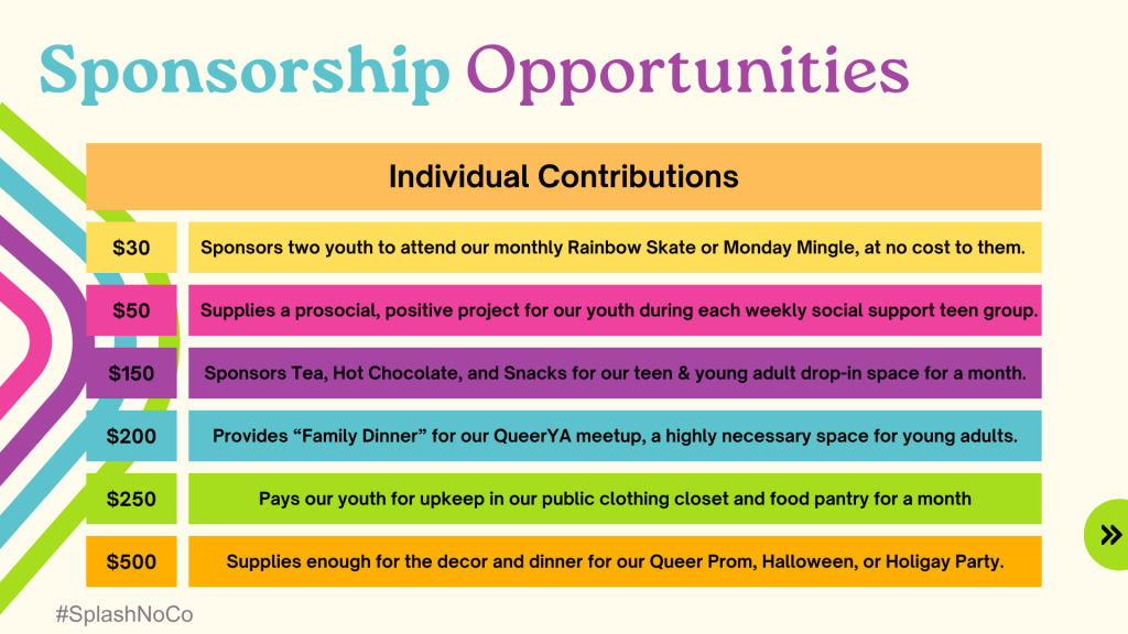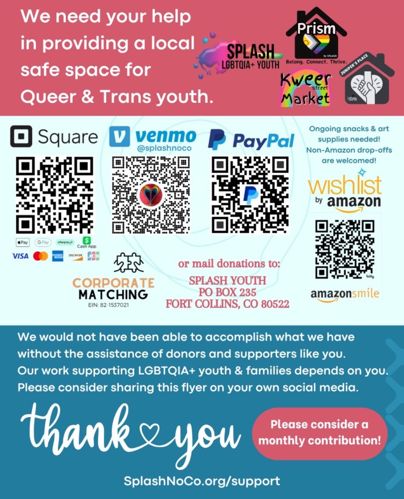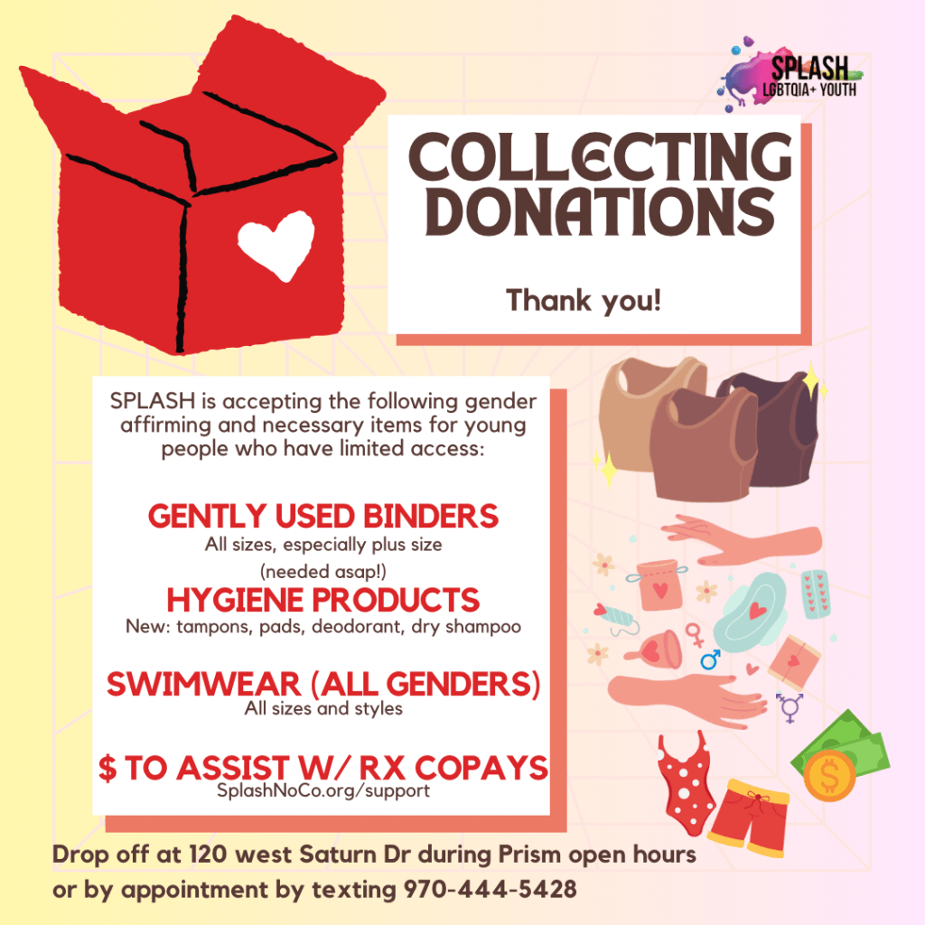 SPLASH is federally and locally recognized as a 501(c)3, your contributions are tax-deductible. Our tax ID is 82-1537021. We depend on your support to provide community programs for young LGBTQIA+ people throughout Northern Colorado!