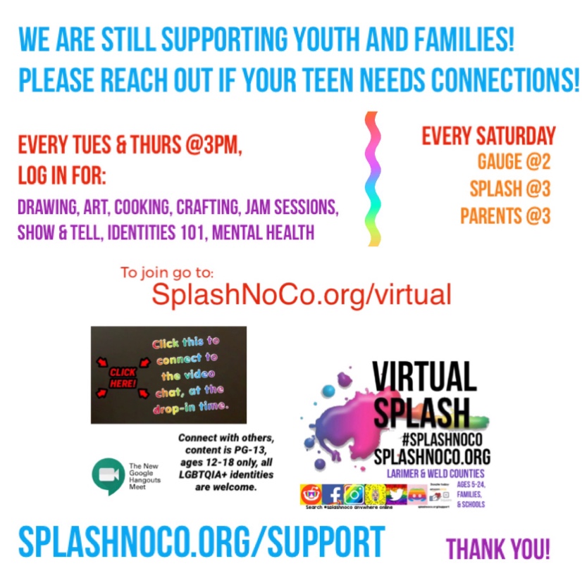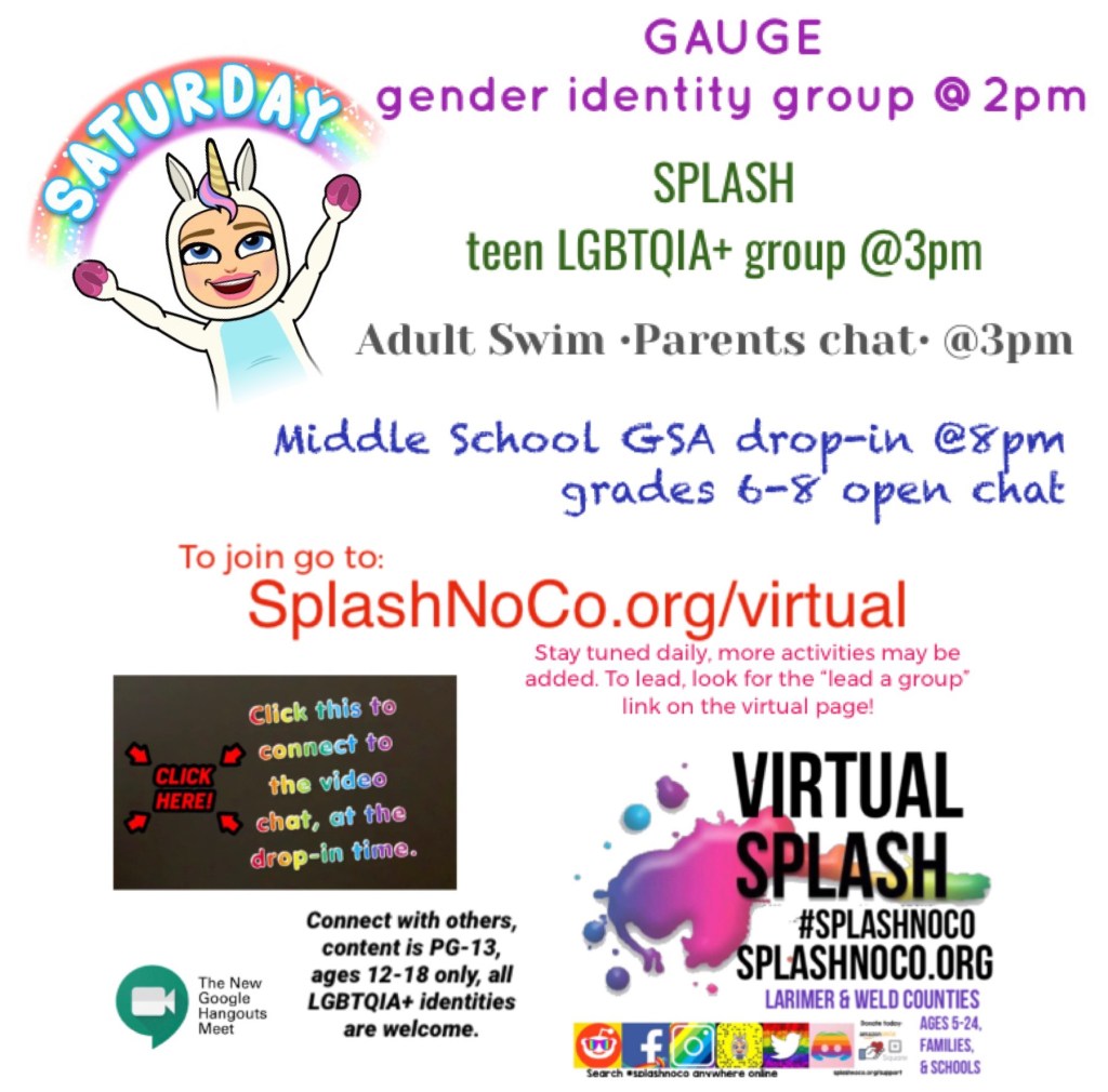 Groups will take place using your computer via meet.google.com or by downloading the google MEET app on your smart phone/device. You must βregisterβ to attend for security purposes. REGISTER HERE Group announcements are happening ongoing, on our social media pages; just search #splashnoco or @splashnoco on any platform.