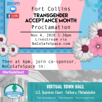 Please join as the City of Fort Collins proclaims November as Transgender Acceptance Month. Shane Patterson, a city employee in Natural Resources, will be accepting the Proclamation!