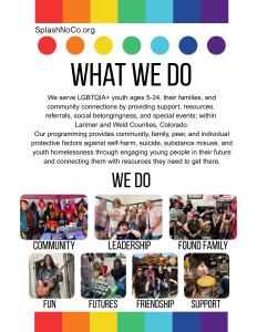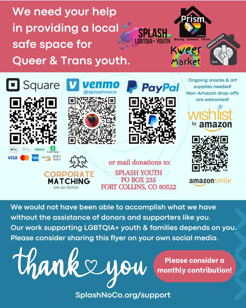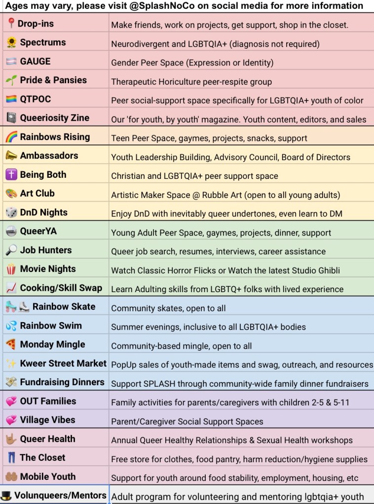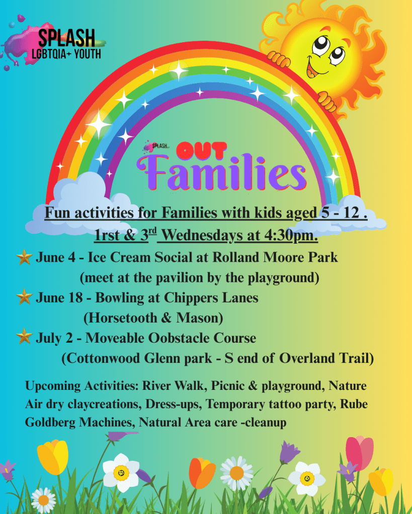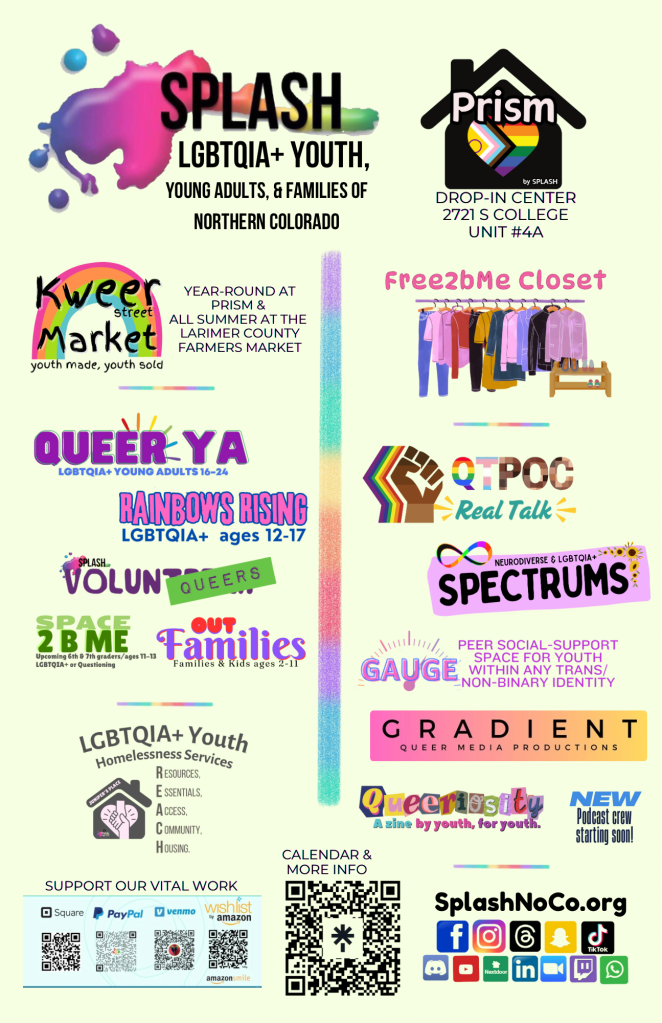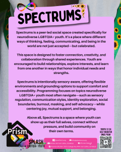 We offer meet-ups and drop-in spaces for youth who are LGBTQIA+ and questioning. We host special events that are fully inclusive of all orientations and identities in substance free, supervised, SafeSpaces.